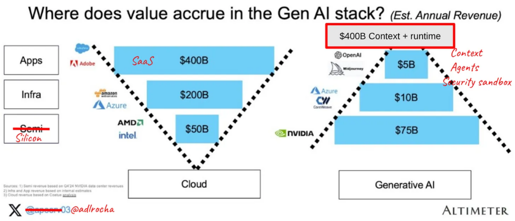 Mais cette lecture est incomplète. Une couche est en train d’émerger au-dessus : celle du contexte, du runtime et des environnements d’exécution sécurisés. C’est cette couche qui va jouer le rôle qu’avait le SaaS dans l’architecture Cloud. La question n’est pas de savoir si cette couche va apparaître, mais qui va l’occuper.